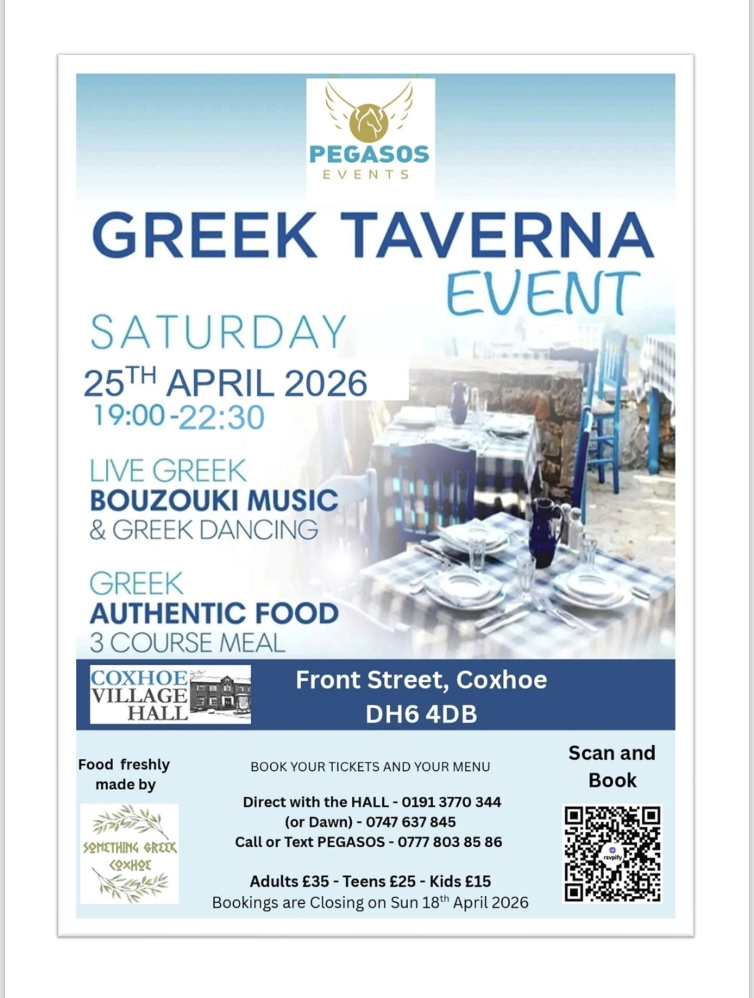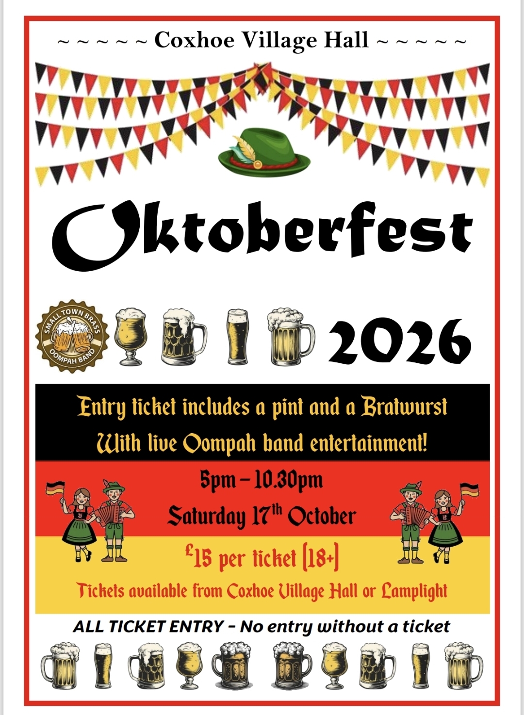 Tickets for all of our events are available from the Village Hall Parish Room, or by emailing: bookings@coxhoevillagehall.com