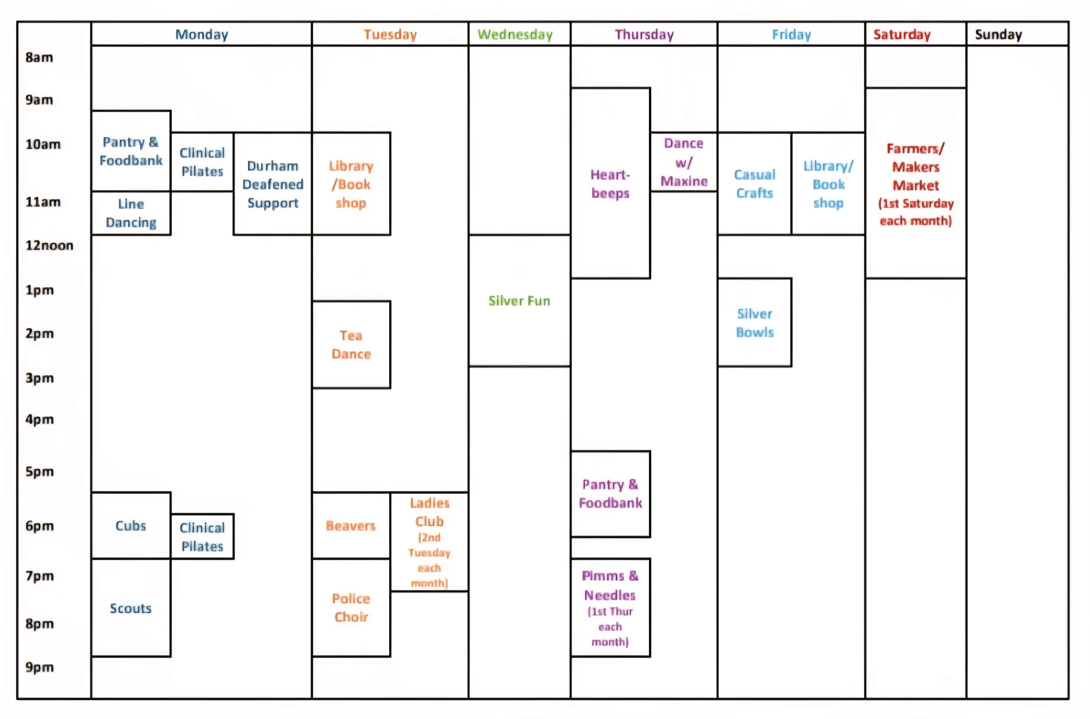 Regular activities at Coxhoe Village Hall: