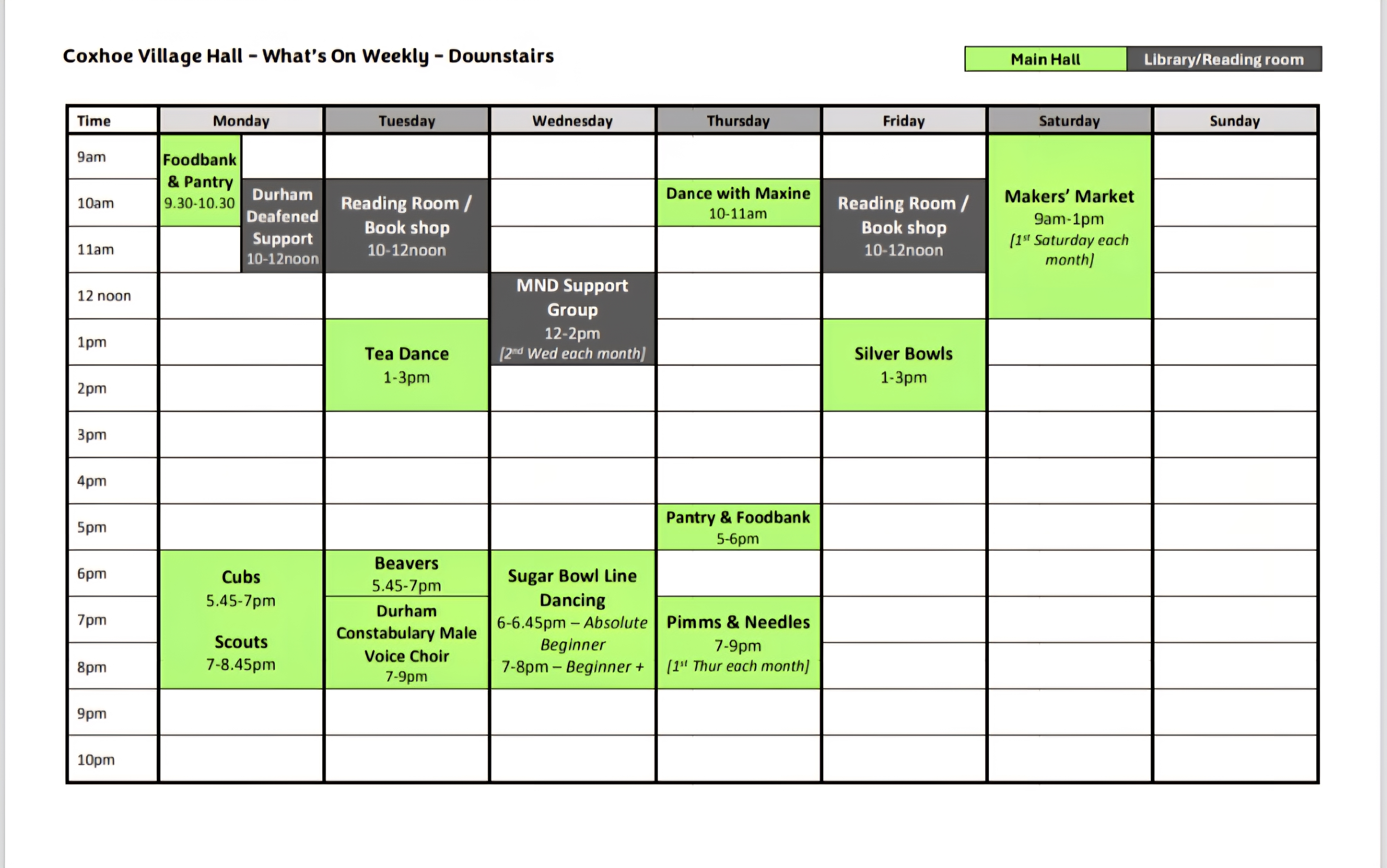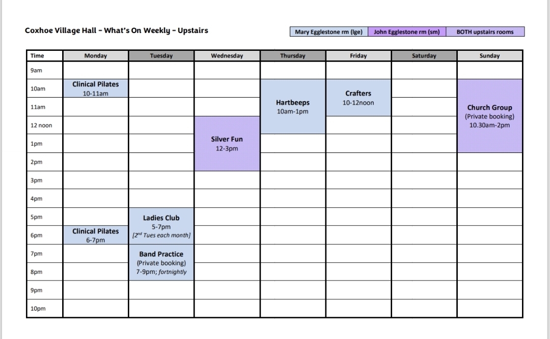 Regular activities at Coxhoe Village Hall: